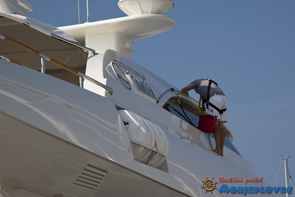 Čiščenje oken na velikih jahtah je vsakodnevno opravilo posadke. In ker so to velika plovila, je to dejansko zelo nevarno delo na višini. Možakar na sliki je dobro pripravljen, saj je privezan na poseben žleb namenjen ravno temu.