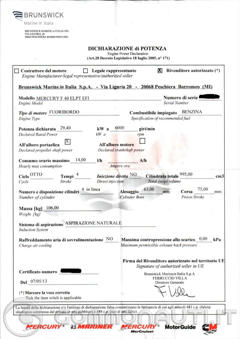 'Libretto del motore' je po novem 'Dichiarazione del Potenza'. Običajno ga dobiš v obliki modrega A4 lista s karateristikami motorja, letnico, serijsko številko, itd....