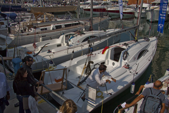 Na sejmu se najde tudi nekaj povsem tekmovalno nastrojenih modelov jadrnic, v ozadju pa lahko vidimo še luksuzni Dufour 525.