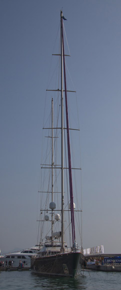 Ob pogledu na tole lepotico pa zastane dih tudi tistim, ki jih jadranje niti malo ne zanima. Jadrnica-jahta sicer ni bila razstavljena na sejmu, temveč v neposredni bližini lepo vidni iz sejemskega prostora in tudi v pravem tematskem delu jadrnic. Očitno opravljajo na njej servis, gre pa za plovilo Mirabella V. Kot sem kasneje ugotovil, naj bi bil lastnik barke ustanovitelj in predsednik grupacije Avis, ki se ukvarja z najemom avtomobilov. Barka je dolga 247 ft, se pravi dobrih 75 m, njen največji ugrez pri spuščeni kobilici doseže 10 m, višina jambora je 88,5 m, med plovbo pa izpodrine za 765 ton vode. Proizvodni stroški so menda narasli preko 50 milijonov USD, za tedenski najem pa morate odšteti najmanj 375.000 USD.