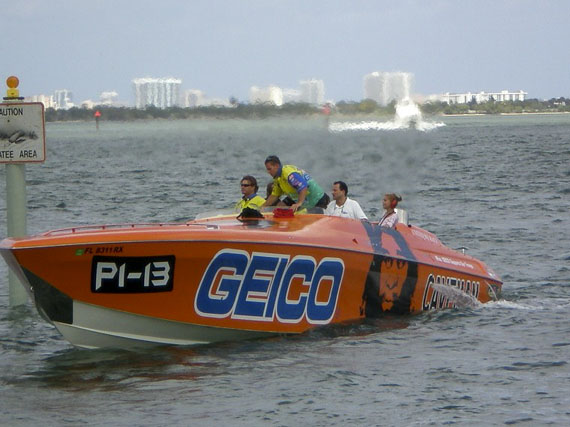 Videti je dimne pline in vročino, ki prihaja iz dveh plinskih turbin, ki ženeta spremljevalni čoln Miss Geico Racing.